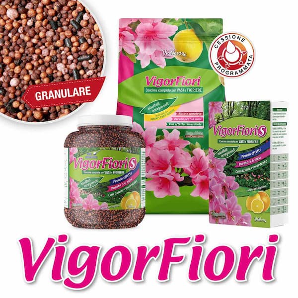 VIGORFIORI è un concime di alta qualità per piante fiorite ed ornamentali in vaso e fioriera. È caratterizzato da un vistoso effetto iniziale e da una cessione programmata per 5-6 mesi. Conferisce alla pianta forza, colore ed una fioritura lunga e rigogliosa. Contiene 2 chelati di ferro (sequestrene e ferrene) con alto e persistente effetto rinverdente.
