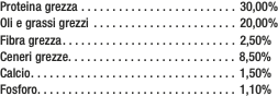 Carne disidratata (pollo e tacchino 30%), mais, frumento, oli e grassi, polpe di barbabietola, carrubina, vitamine e minerali, F.O.S. (frutto-oligo-saccaridi), lievito di birra.