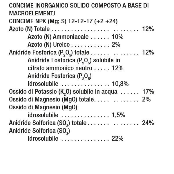 Il BLU 12-12-17 è un concime complesso di qualità per tutte le colture erbacee ed arboree da frutto. Ha il fosforo ad alta solubilità ed è completo di microelementi.