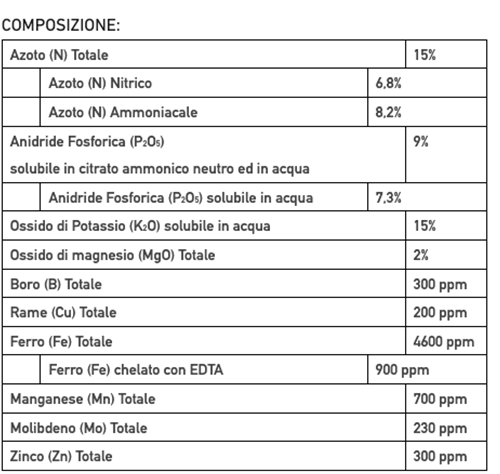 - Purezza Superiore, la maggior concentrazione di Fosforo totale unita all’incremento della sua frazione solubile in acqua ed il minor contenuto in Solfati (-30%) assicurano l’efficace apporto di elementi solubili in acqua durante tutto il ciclo;