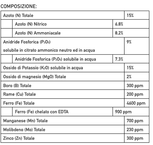 - Purezza Superiore, la maggior concentrazione di Fosforo totale unita all’incremento della sua frazione solubile in acqua ed il minor contenuto in Solfati (-30%) assicurano l’efficace apporto di elementi solubili in acqua durante tutto il ciclo;