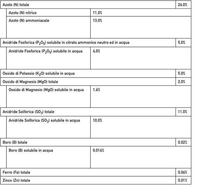 Concime NPK (+MgO+SO3) 24-5-5 (+2+12) con inibitore della nitrificazione (DMPP) con Boro (B), Ferro (Fe) e Zinco (Zn)