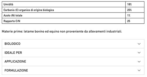 Informazioni aggiuntive: Dopo un prolungato processo di maturazione, in cui raggiunge un elevato grado di umificazione, il prodotto viene sottoposto a trattamento termico di sanificazione, previsto per legge di un’ora a 70°C per l’eliminazione di eventuali organismi patogeni. Questo trattamento permette di ottenere un prodotto finale sicuro e con un contenuto di umidità basso e costante. Il processo di compostaggio e maturazione determina un elevato contenuto di acidi umici e fulvici del formulato che è in grado di aumentare la fertilità agronomica del suolo, migliorandone le caratteristiche fisico-chimiche e stimolando l’attività microbiologica.