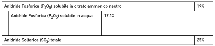 PERFOSFATO SEMPLICE contiene fosforo, utile nelle condizioni di carenza strutturale dei terreni o nutrizionale delle colture. L’elevata dotazione di zolfo sotto forma di anidride solforica (SO3) permette un’azione correttiva dei terreni caratterizzati da elevata salinità e/o alcalinità ed esplica un’azione di contenimento nei confronti di avversità parassitarie attribuibili a funghi presenti nel terreno.
