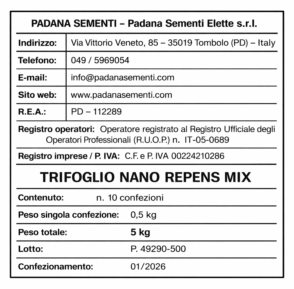 La varietà in purezza TRIFOGLIO REPENS NANO è una specie leguminosa perenne impiegata per la semina di piccole superfici solitamente a scopo ornamentale o decorativo. Il tappeto erboso formato dal TRIFOGLIO REPENS NANO è decorativo e molto strisciante, dovuto dal suo fogliame e dalla intensa fioritura primaverile-estiva che si distingue per la sua elevata capacità coprente.