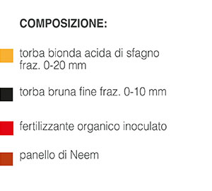 terriccio di altissima qualità consentito in agricoltura biologica, arricchito con il panello di Neem* (frutto oleario di un grande albero asiatico Melia Azadirachta) il quale svolge un’azione contro gli insetti del terreno ed in parte, trasferisce questa azione all’intera pianta, proteggendola da alcuni insetti. Inoltre, il terriccio è inoculato con microrganismi naturali (trichoderma, micorrize e batteri utili della rizosfera) che migliorano l’apparato radicale e proteggono le radici da eventuali malattie fungine, rendendole più forti e attive. È composto dalle migliori torbe di sfagno (bionde e brune), e non contiene compost o altri sottoprodotti. È soffice ed odora di sottobosco. Ha un’ottima porosità pur mantenendo un’elevata ritenzione idrica. Garantisce un ottimo ed equilibrato nutrimento ed un forte attecchimento radicale.