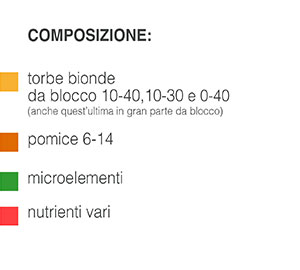 COMPONENTI: torbe bionde da blocco 10-40, 10-30 e 0-40 (anche quest’ultima in gran parte da blocco), pomice dell’Europomice di Pitigliano, microelementi, 4 Kg/mc di concime pillolato (con durata a scelta del cliente), nutrienti vari.